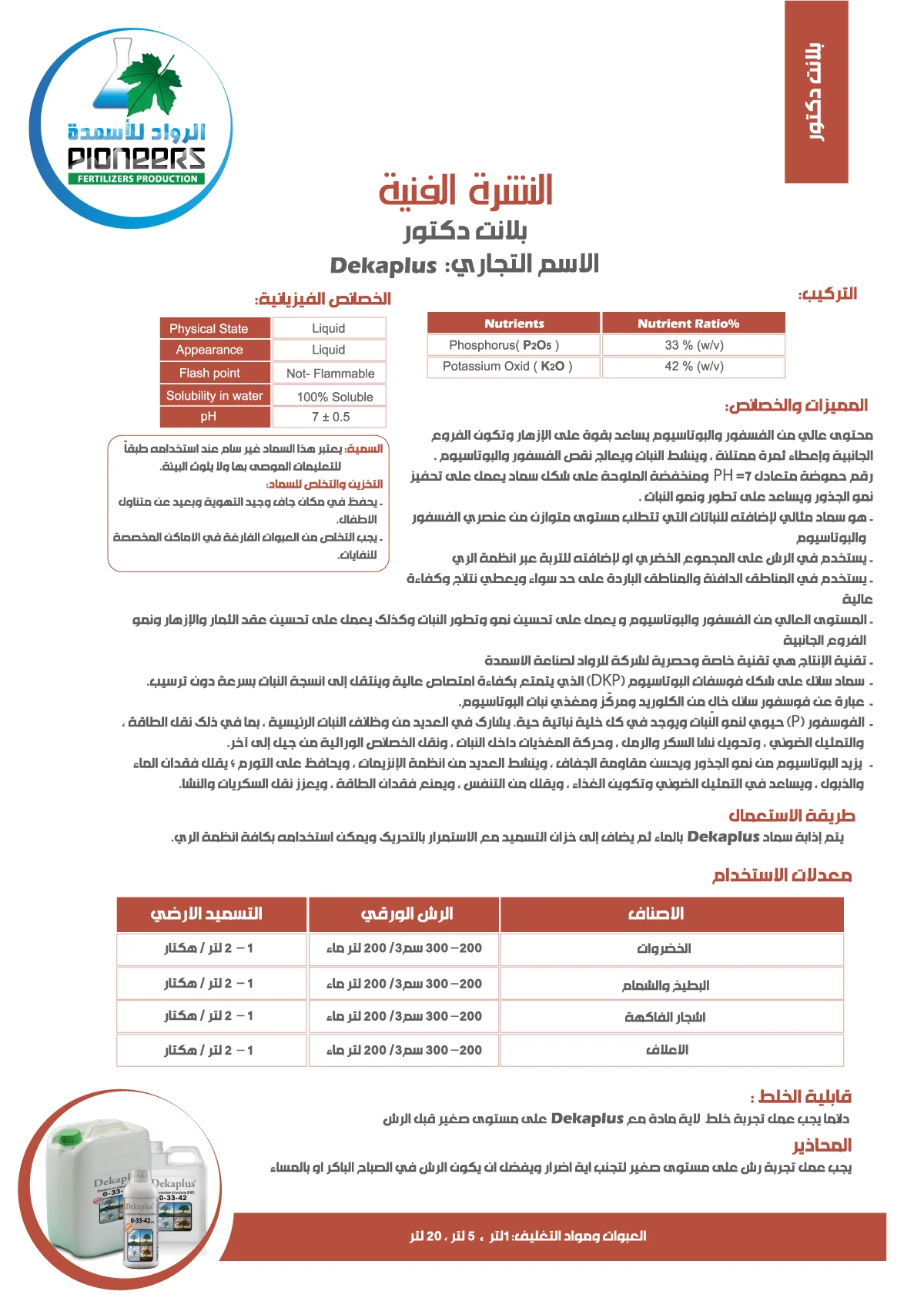 The product features a unique blend of potassium and phosphorus with a neutral acidity (pH = 7) and low electrical conductivity (EC), presented in a liquid form to enhance root and overall plant development.