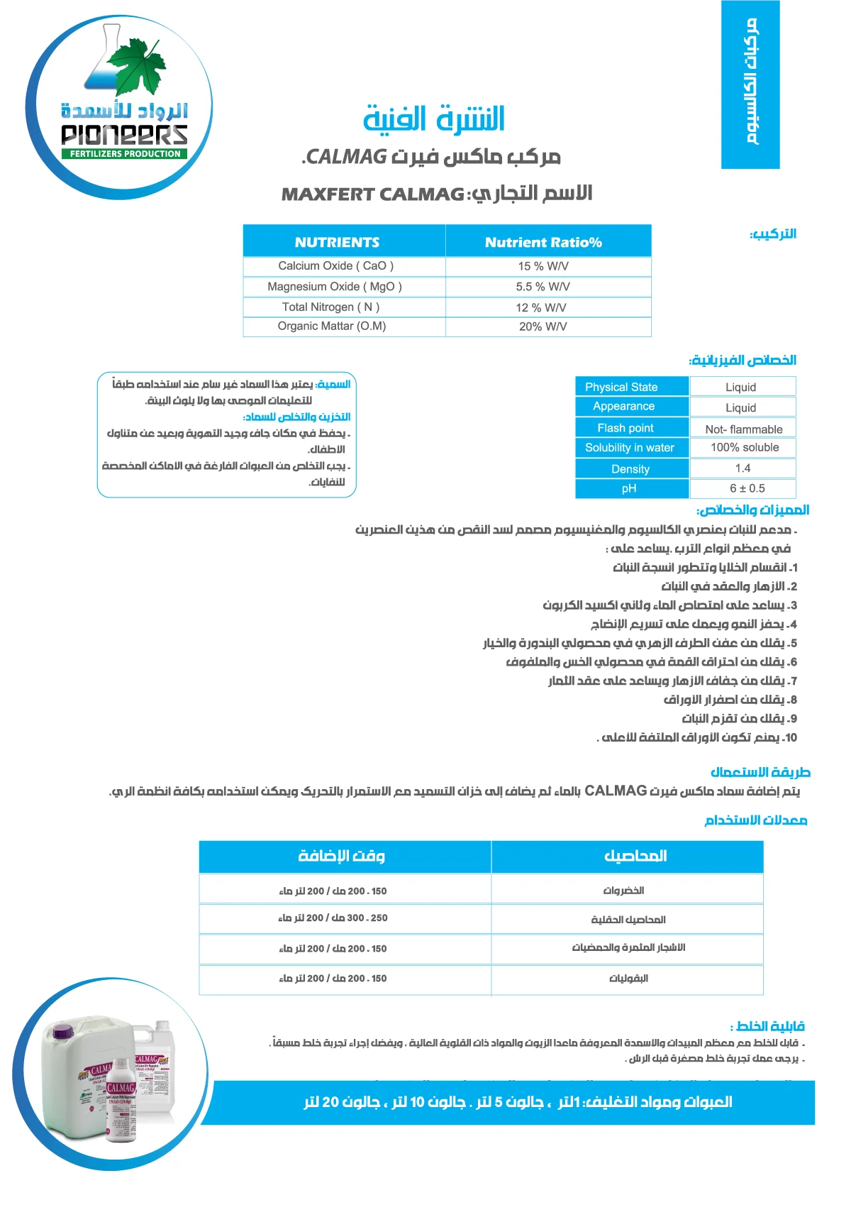 مكمل زراعي يحتوي على الكالسيوم والمغنيسيوم، مصمم لسد نقص هذين العنصرين في معظم أنواع التربة. يساعد في: انقسام الخلايا، تطوير الأنسجة النباتية، وتنشيط ظهور الزهور والعقد في النباتات. يساهم في امتصاص الماء وثاني أكسيد الكربون، يحفز النمو، ويسرع نضج الثمار. يقلل من: تعفن نهاية الزهرة في محاصيل الطماطم والخيار، ويقلل من احتراق القمم في محاصيل الخس والملفوف. يقلل من جفاف الزهور، ويساعد في تكوين الثمار، ويقلل من اصفرار الأوراق، ويخفف من قصر النباتات. يمنع تشكيل الأوراق الملتوية upwards.