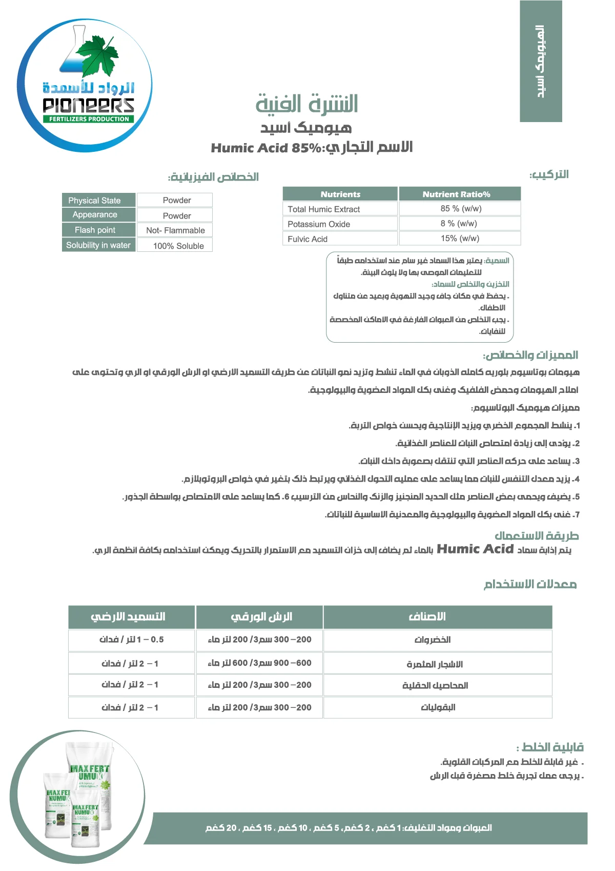 بلورات الهيومات البوتاسيوم قابلة للذوبان تمامًا في الماء. تعمل على تنشيط وزيادة نمو النباتات من خلال تخصيب التربة، الرش الورقي أو الري. تحتوي على أملاح الهيومات وحمض الفولفيك وتعتبر غنية بجميع المواد العضوية والبيولوجية.