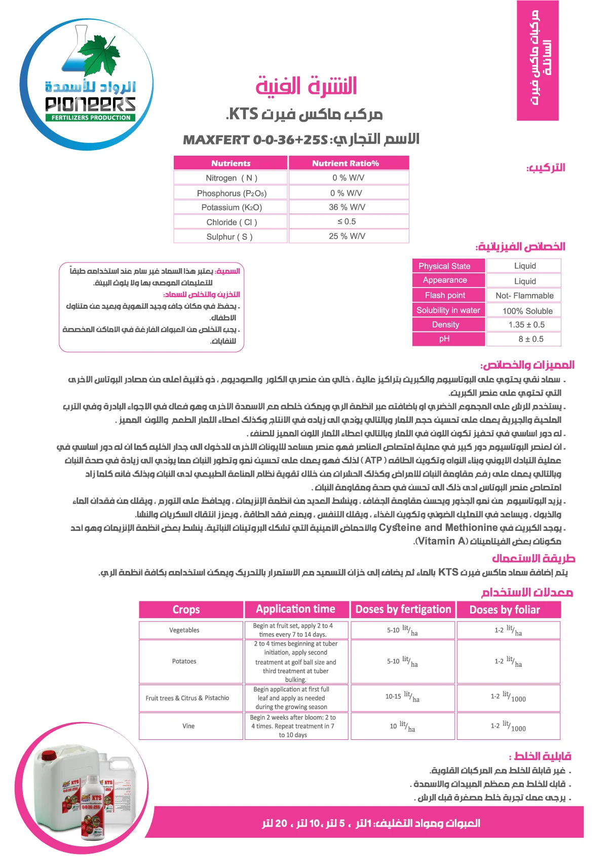 KTS 0-0-36+25S منتج سمادي نقي يحتوي على تركيزات عالية من البوتاسيوم والكبريت، خالي من الكلور والصوديوم، وذو قابلية ذوبان أعلى من المصادر الأخرى للبوتاش التي تحتوي على الكبريت. يمكن استخدامه لرش المجموعة الخضراء أو إضافته عبر أنظمة الري، كما يمكن مزجه مع أسمدة أخرى. يظهر فعاليته في الأجواء الباردة وفي التربة المالحة والجيرية. يساهم في تحسين حجم الثمار، مما يؤدي إلى زيادة الإنتاج، بالإضافة إلى منح الثمار طعماً ولوناً مميزين. يلعب دوراً أساسياً في تحفيز تكوين اللون في الثمار، مما يمنحها اللون المميز للصنف.